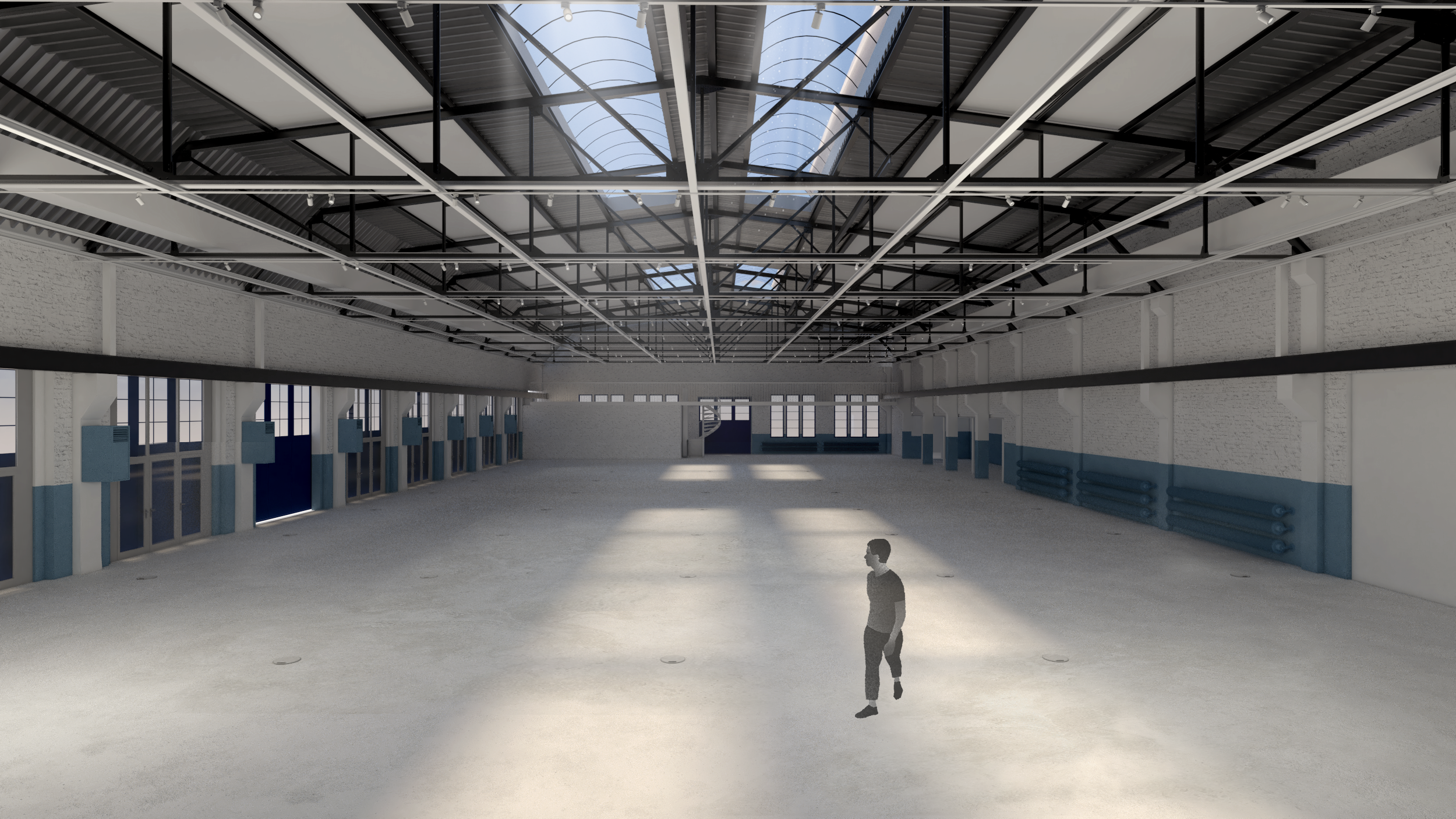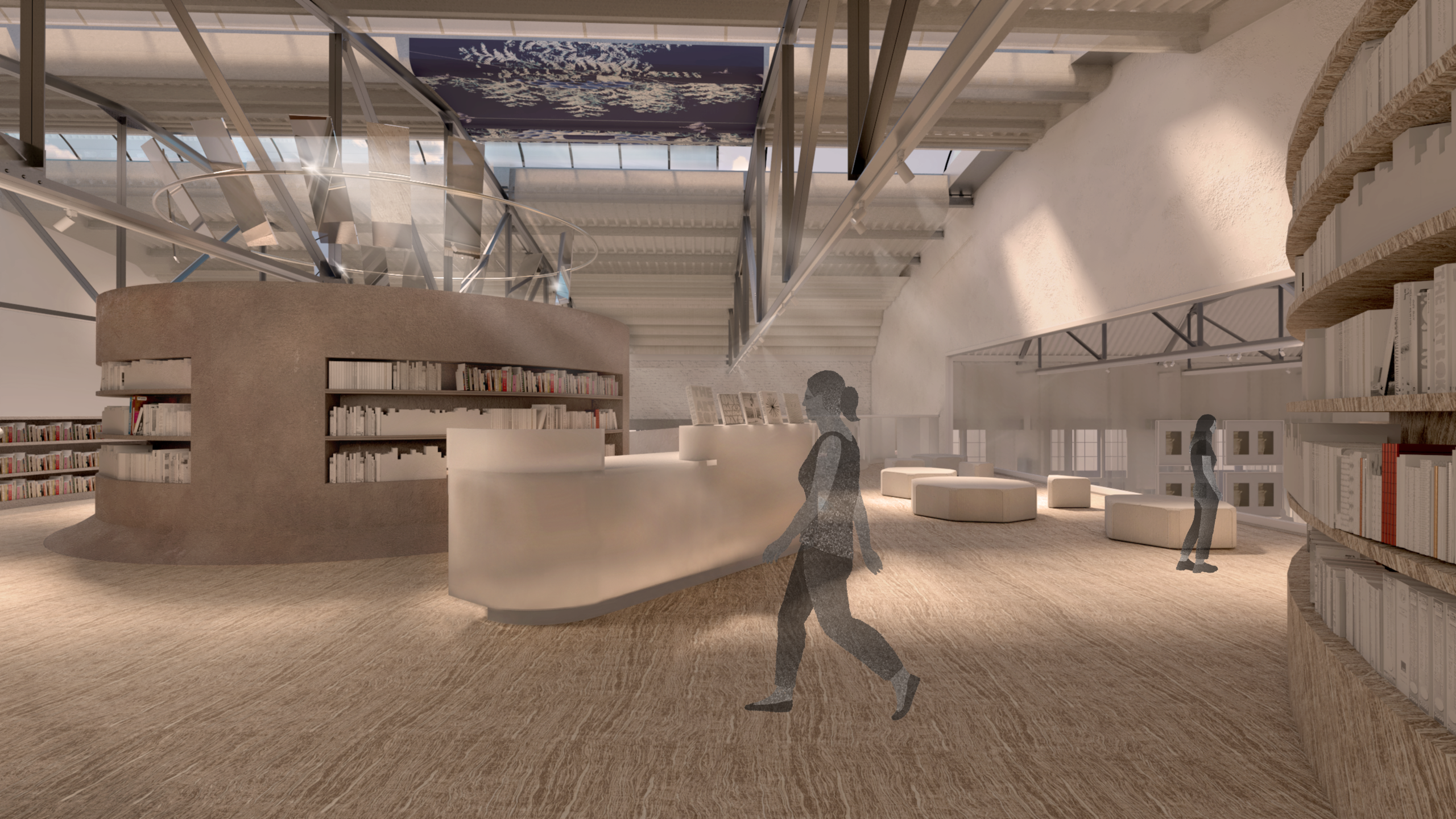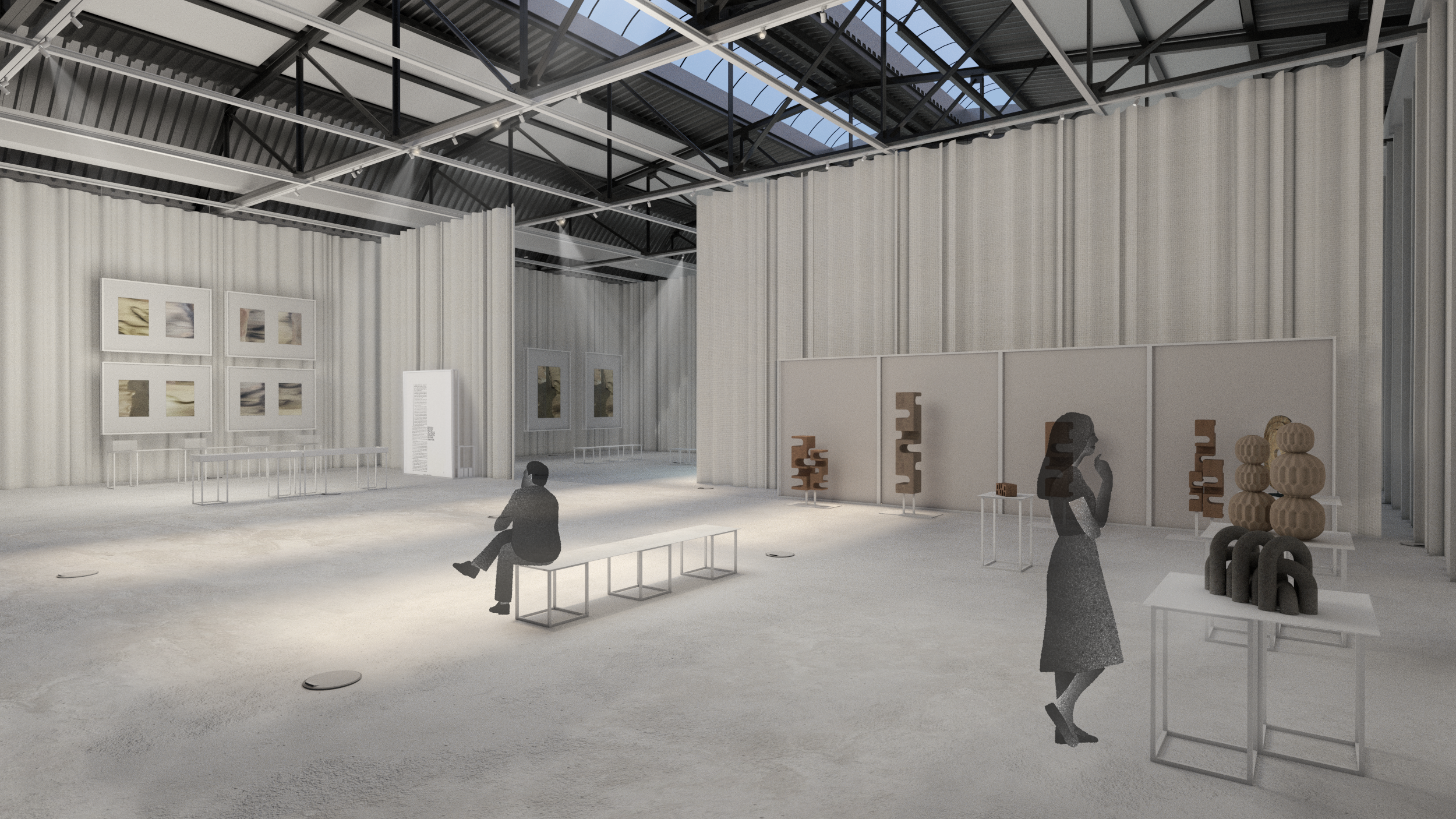 The exhibition space is fully flexible and modular — ready for large-scale installations, performance, sound and video art, or intimate displays. Historic industrial elements remain visible, forming a calm backdrop that lets each exhibition transform the space anew. The modular display system is designed for repeated use, minimizing waste and supporting a circular approach to materials, so every show can evolve without generating new production footprint.