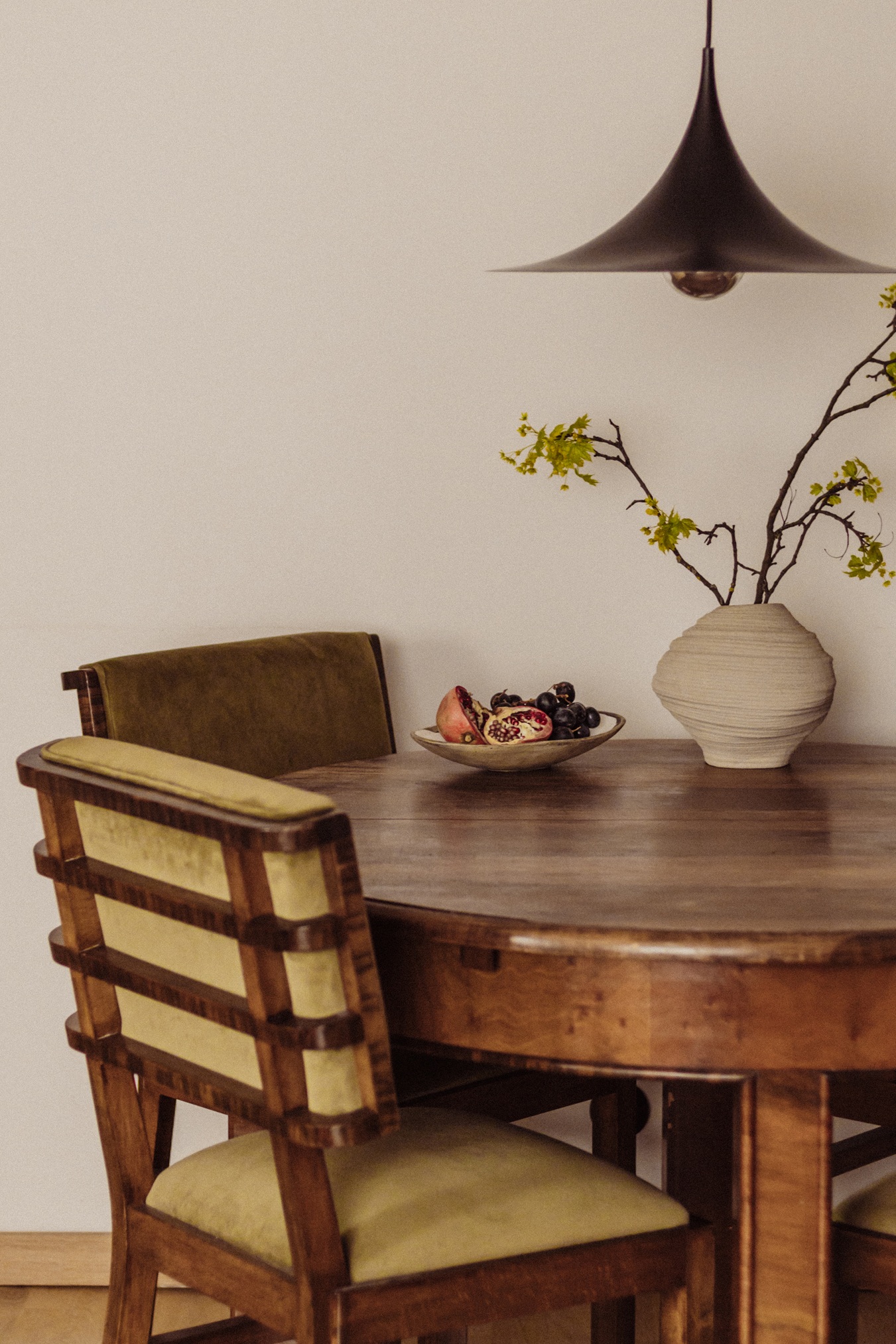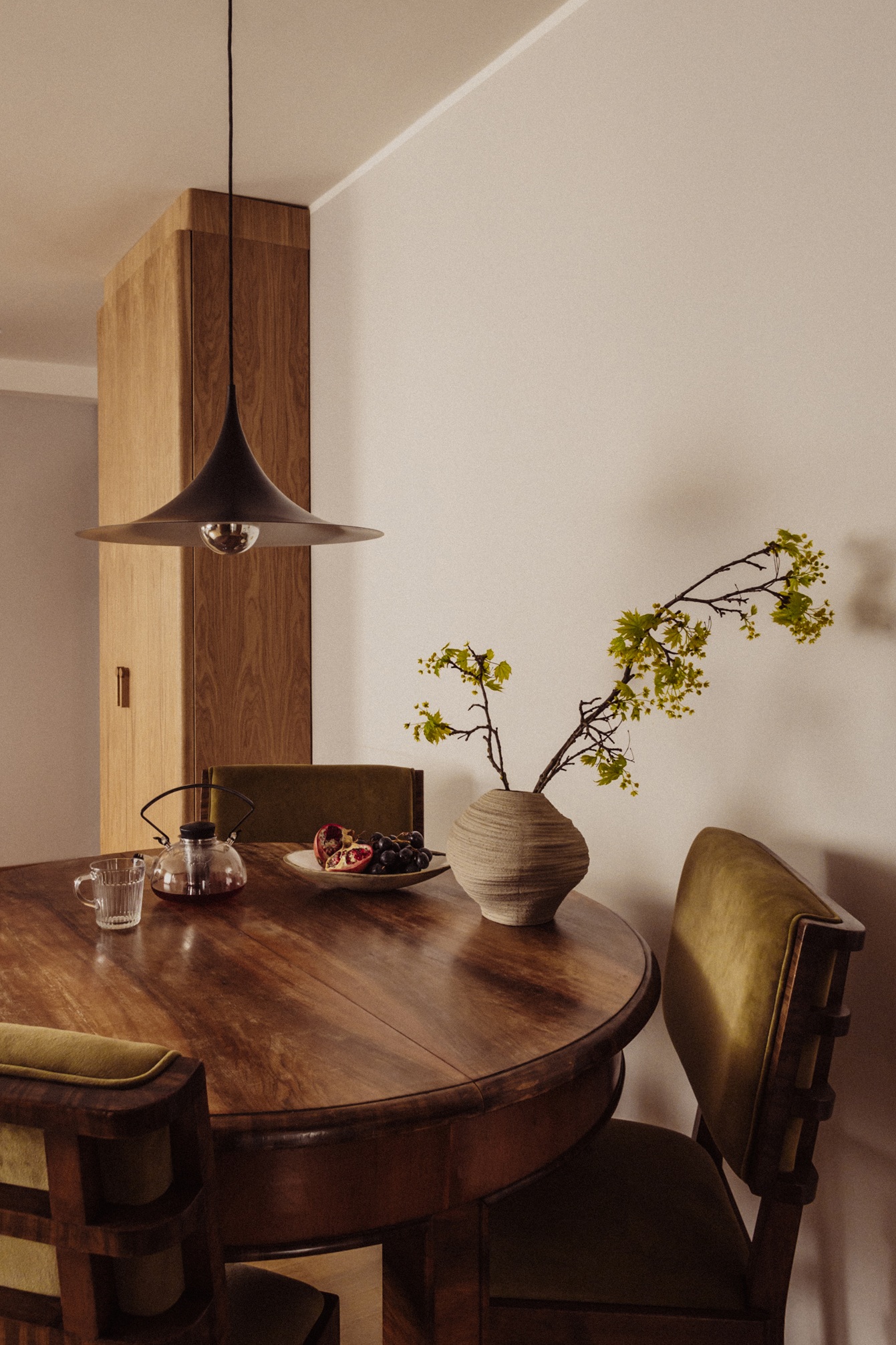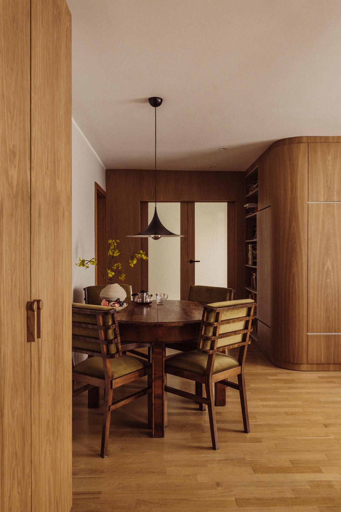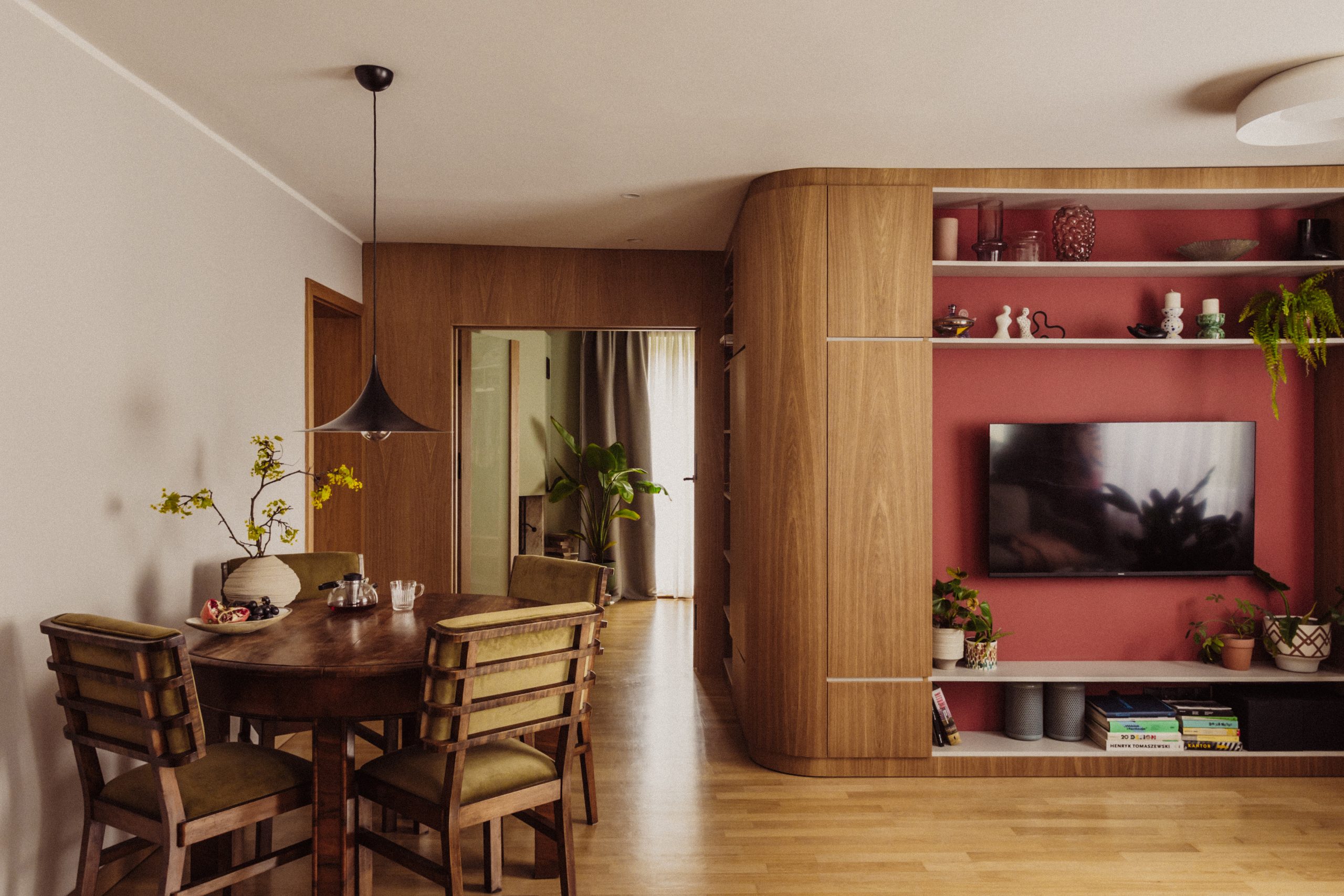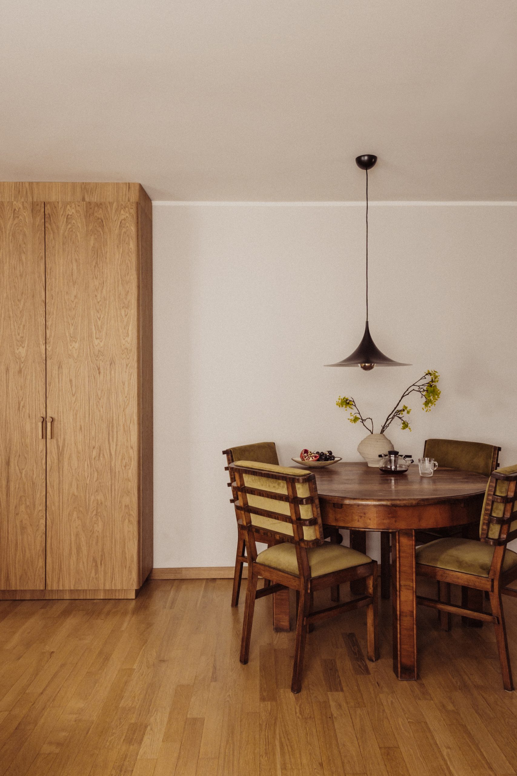 Modernist inspirations appear in the built-in details and 1930s furniture, while natural materials – wood, stone, and greenery – bring warmth and harmony. The interior style is a thoughtful mix of new and vintage elements, in a harmonious palette of burgundy, green, and warm wood tones. This is a space full of life and history, offering room for relaxation, work, and everyday living.