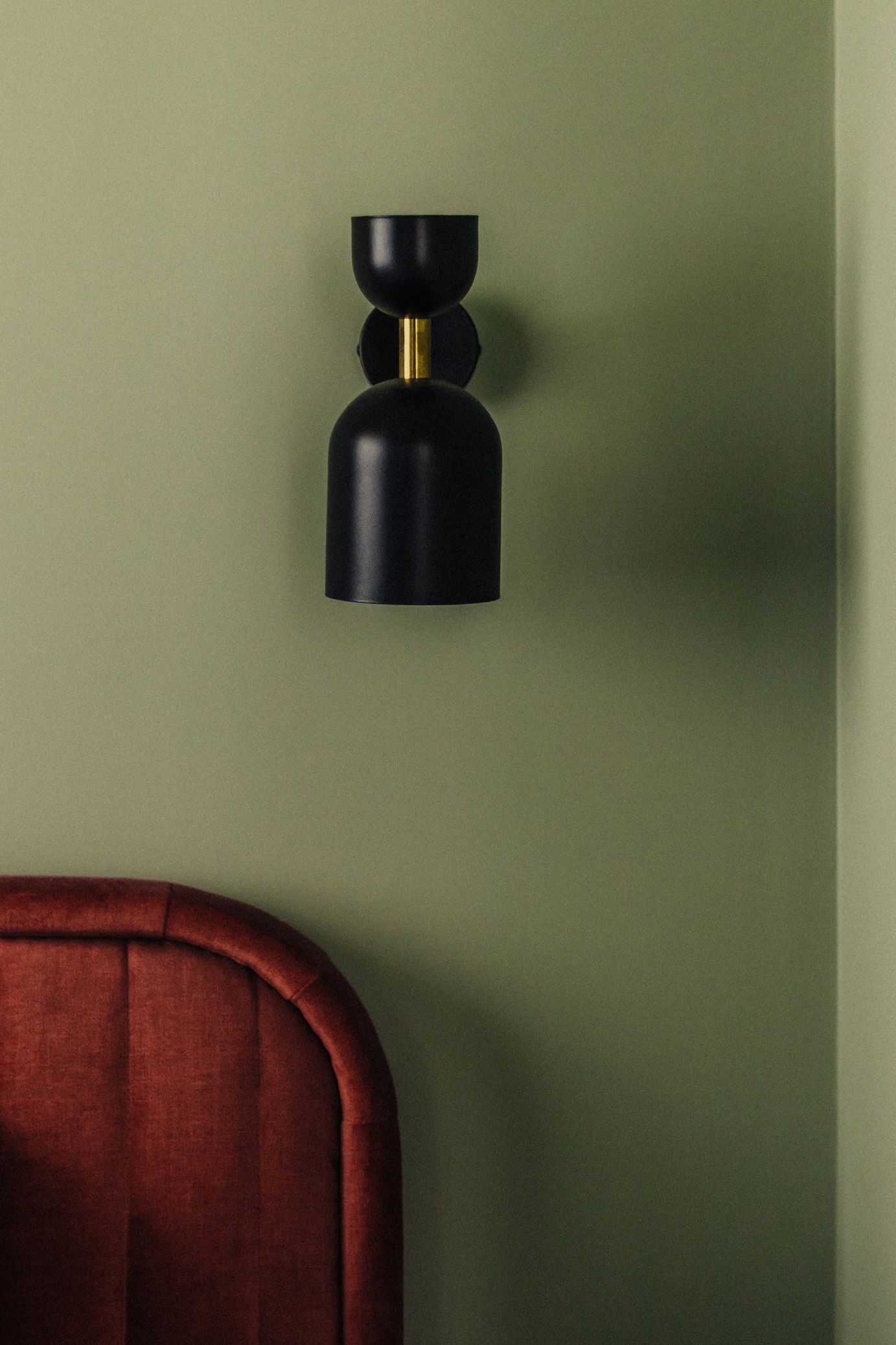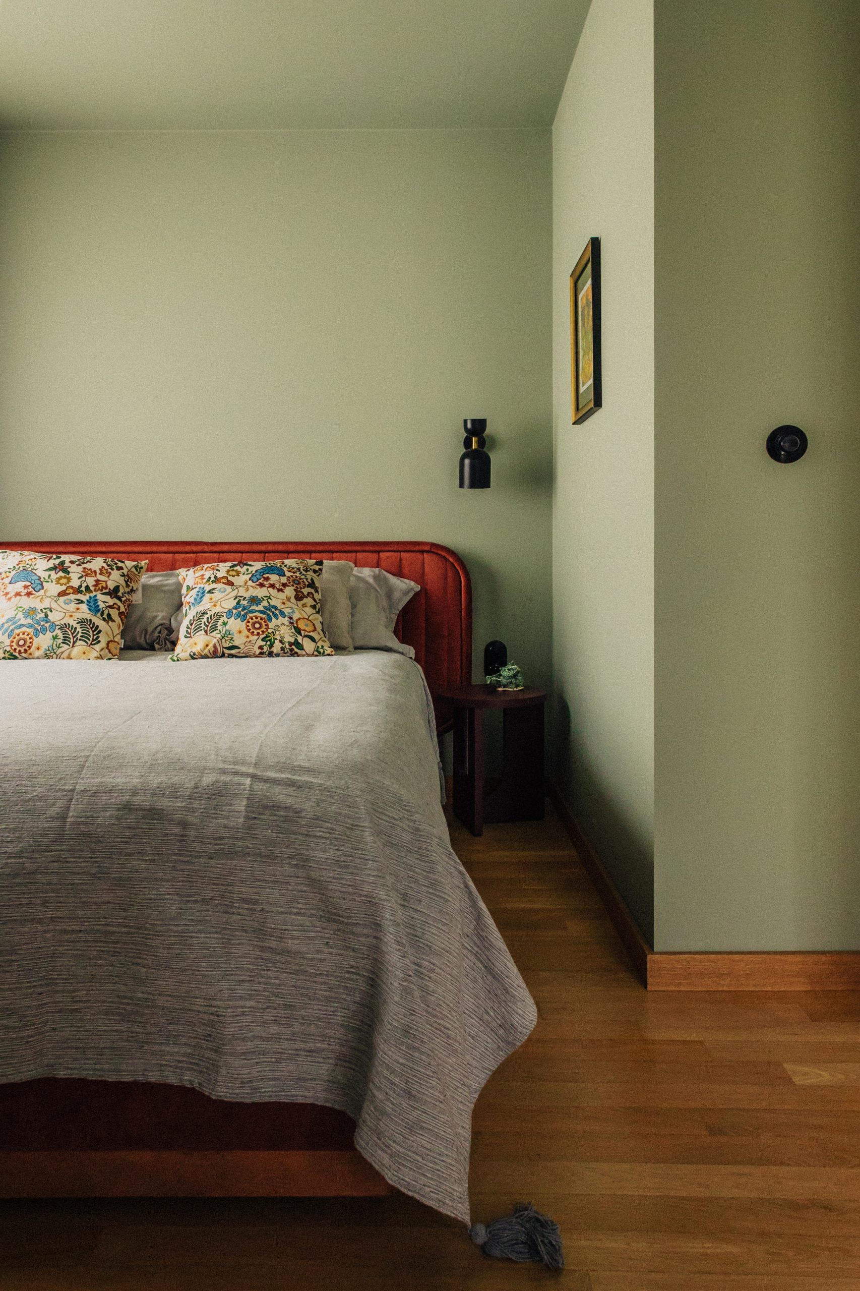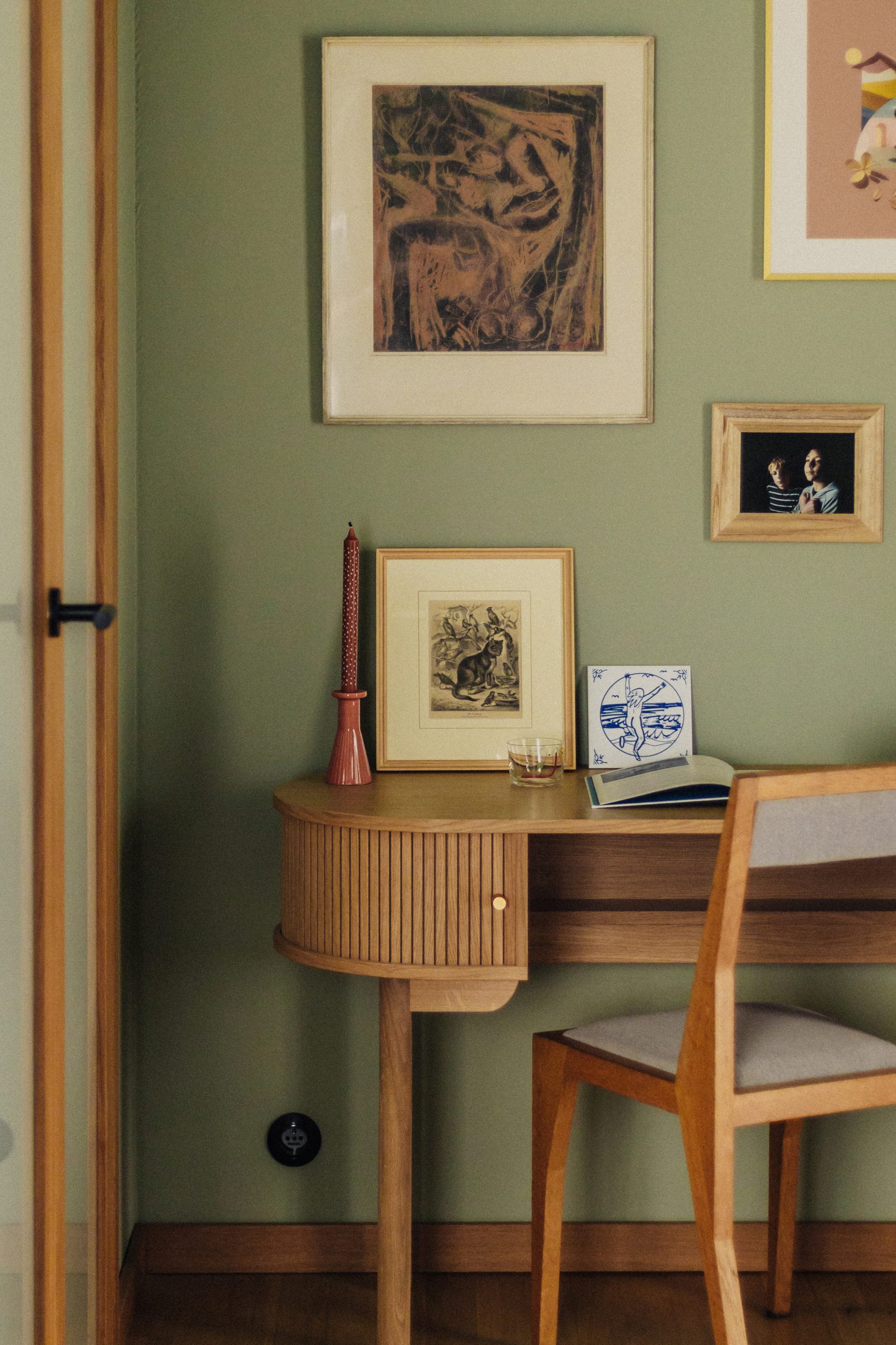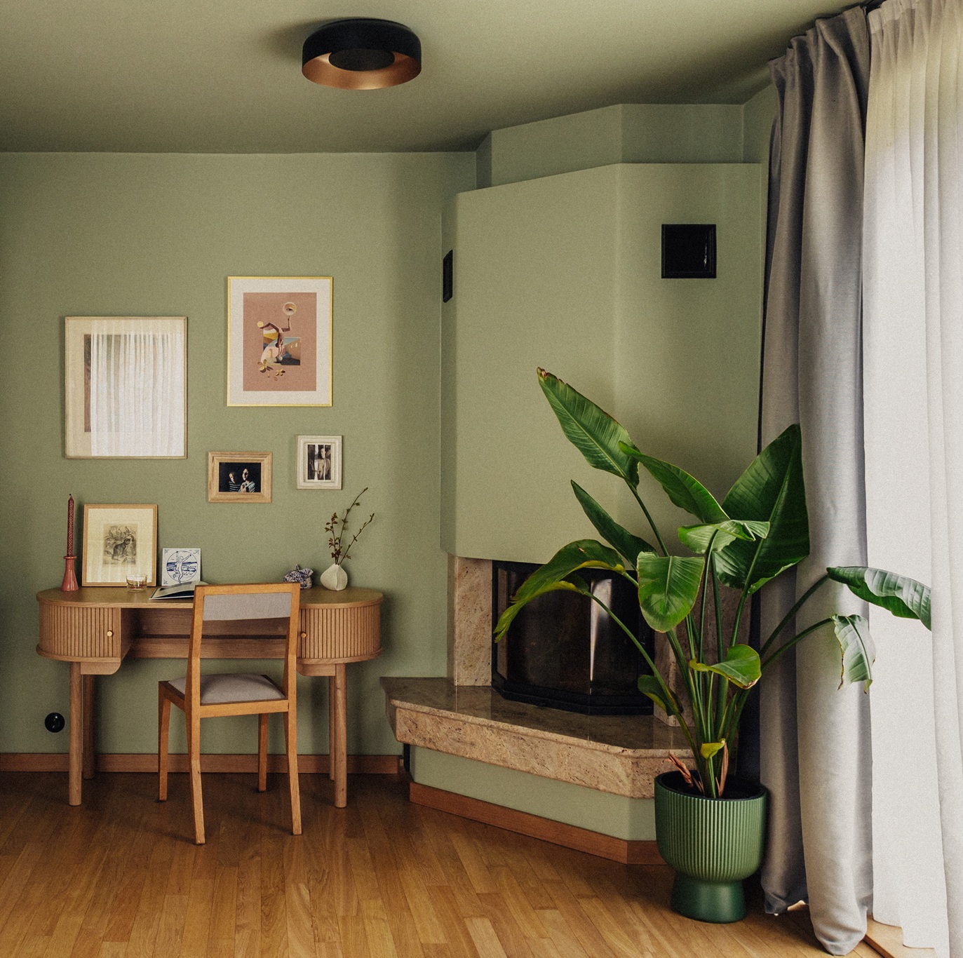 Modernist inspirations appear in the built-in details and 1930s furniture, while natural materials – wood, stone, and greenery – bring warmth and harmony. The interior style is a thoughtful mix of new and vintage elements, in a harmonious palette of burgundy, green, and warm wood tones. This is a space full of life and history, offering room for relaxation, work, and everyday living.
