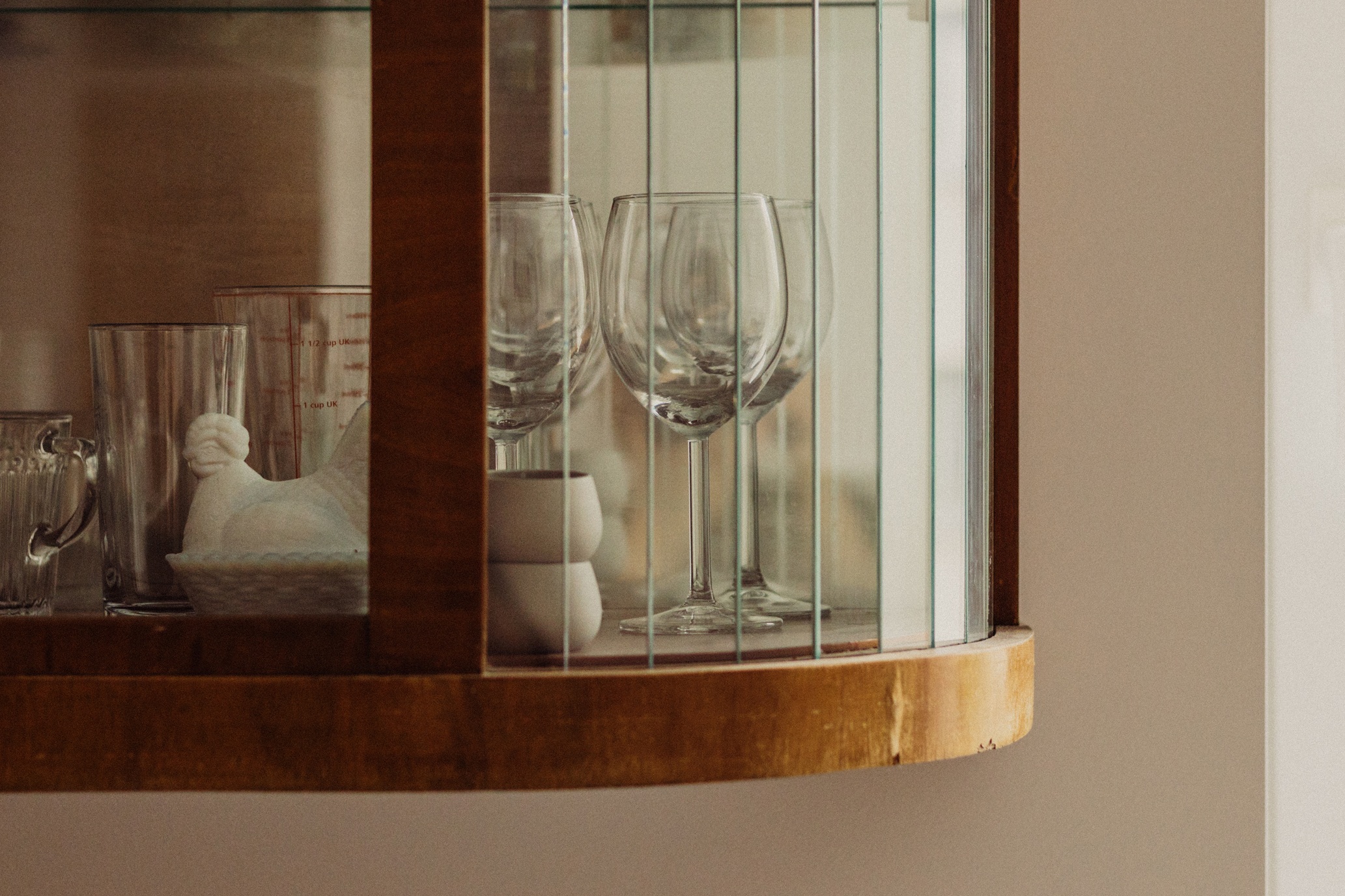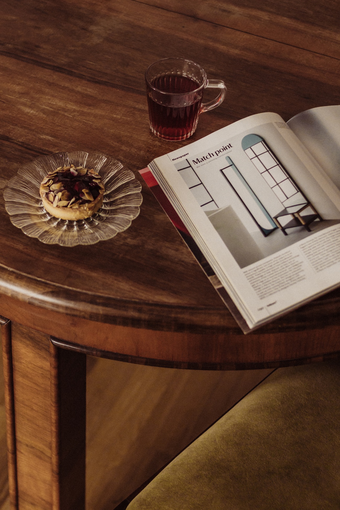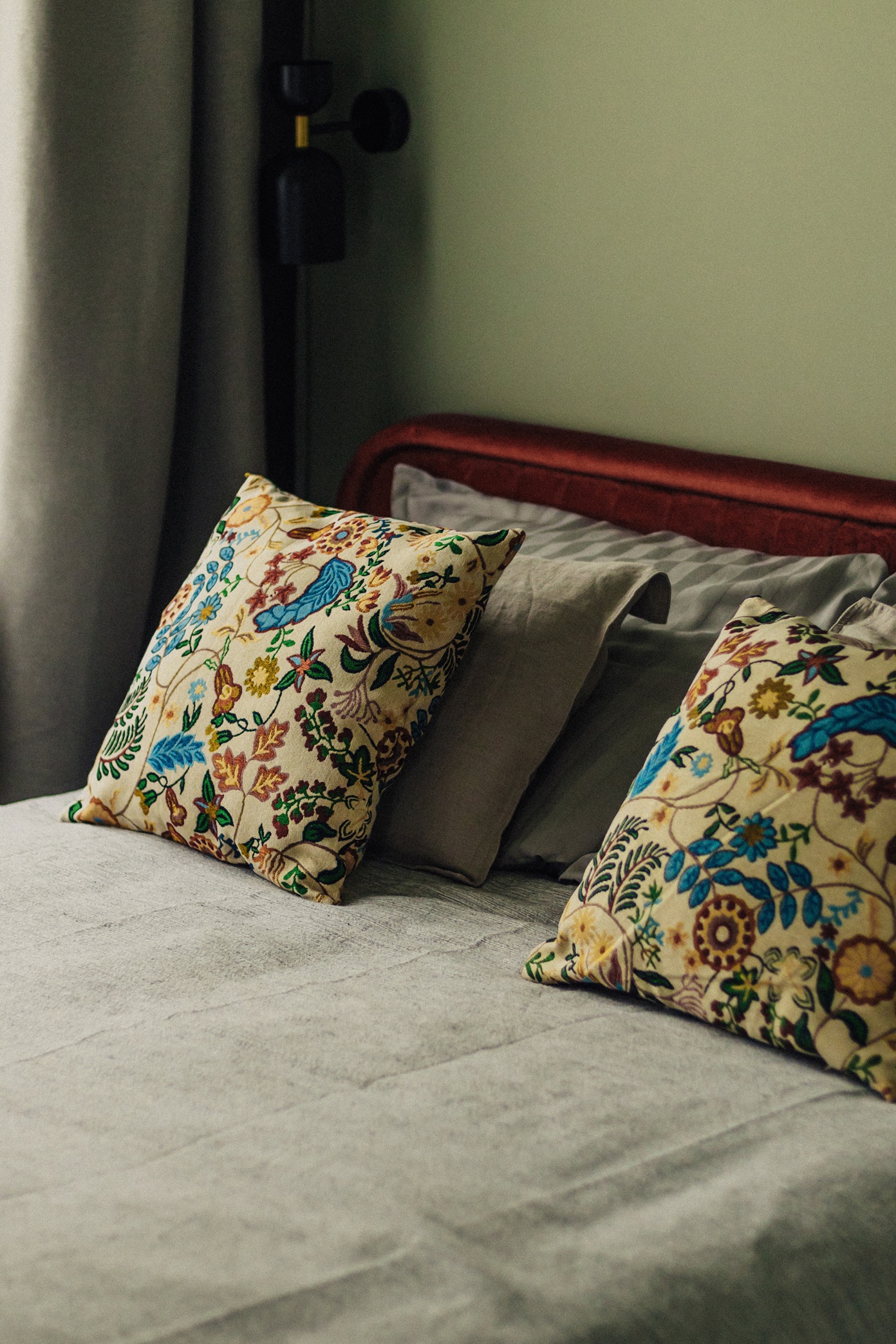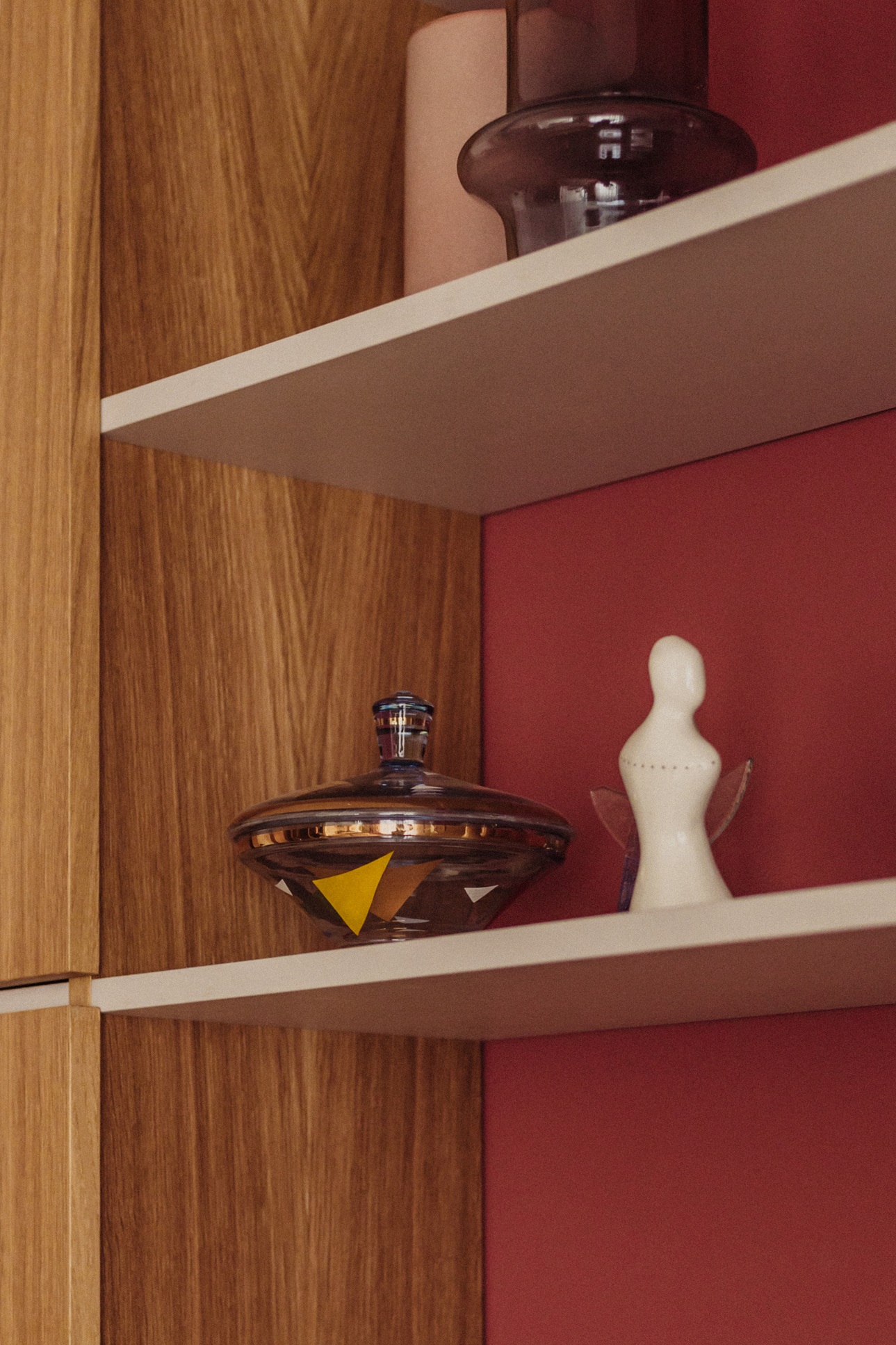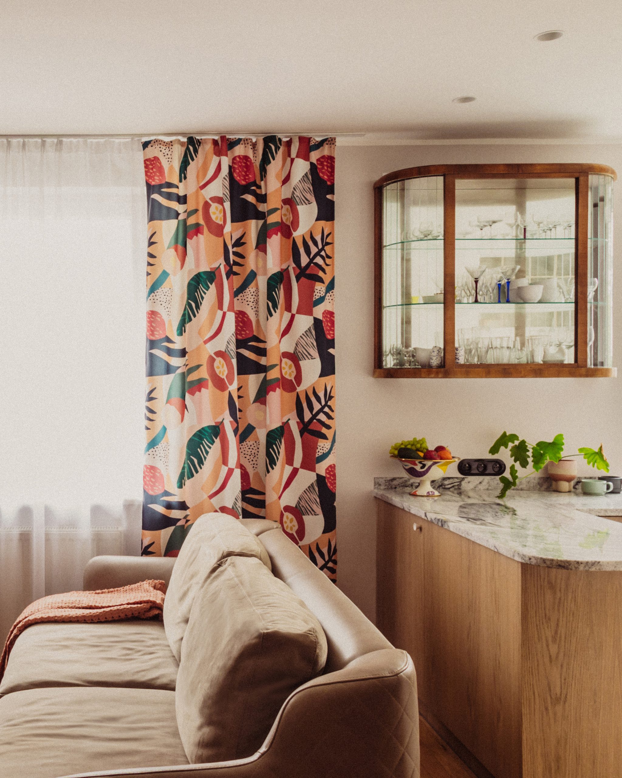 Modernist inspirations appear in the built-in details and 1930s furniture, while natural materials – wood, stone, and greenery – bring warmth and harmony. The interior style is a thoughtful mix of new and vintage elements, in a harmonious palette of burgundy, green, and warm wood tones. This is a space full of life and history, offering room for relaxation, work, and everyday living.