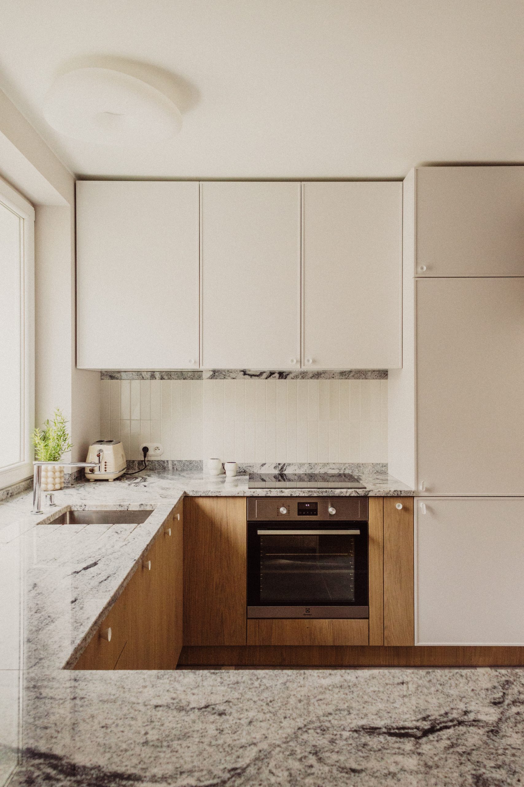 In Gdynia, within a 1930s modernist building, lies an apartment full of light and history. With windows facing three directions, the interior is bright and spacious throughout the day. The functional layout has been completely redesigned – the living room flows into the kitchen, while the bedroom with a fireplace and an additional zone offer comfort and privacy. Original oak flooring and door joinery blend the building’s historical character with modern design.